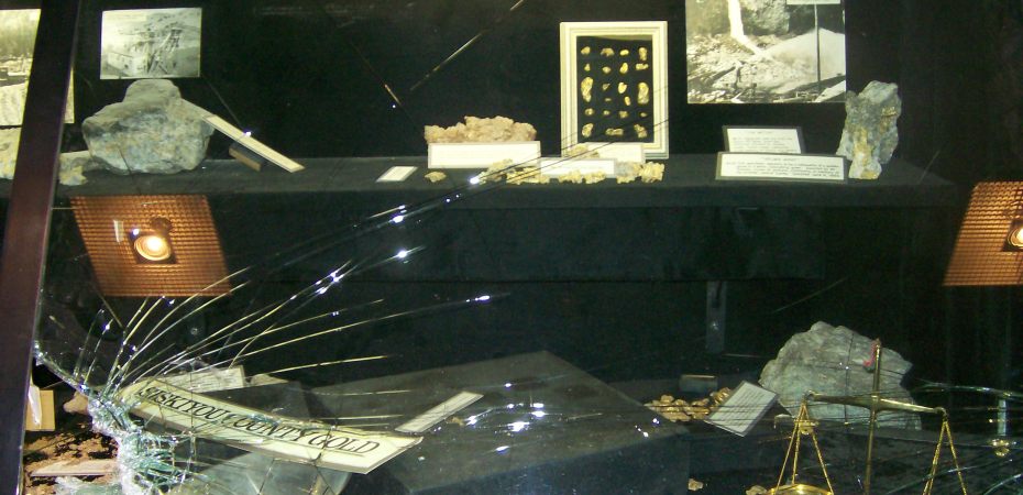 On the morning of February 1, 2012, before the general public began entering the Siskiyou County Courthouse, County Maintenance Supervisor Billy McCully and two others entered the building on their way to work. Once inside, they were shocked to discover that the gold display in the front entryway had been severely compromised. For decades it had proudly displayed a fortune in gold discovered in the hills, mountains, rivers, and streams of Siskiyou County since the 1850’s. They saw that a hole had been smashed in one of the glass panels of the display large enough for a man to put his arm through, and that a significant portion of the contents of the display was gone!
