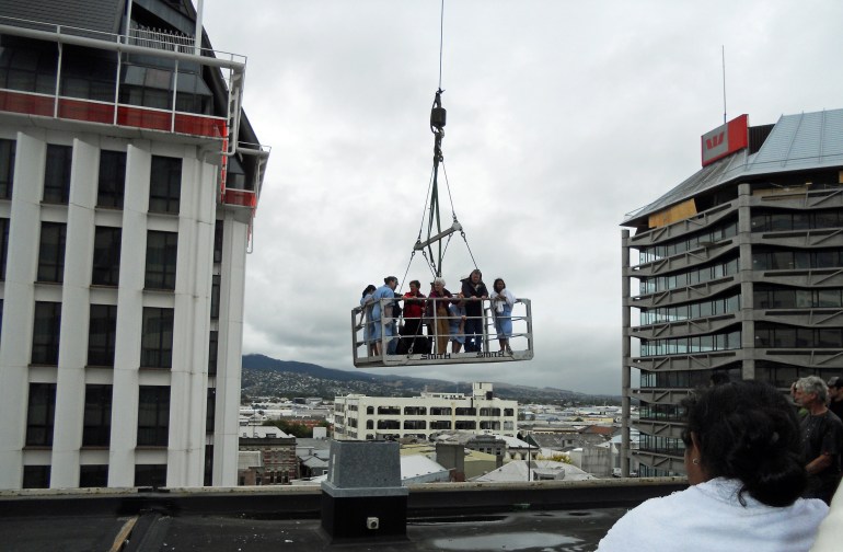 A helicopter landed on the roof, but only stayed a few minutes and took off. This was disconcerting, but soon a construction crane positioned itself down below on Cashel Street, and sent its bucket up to us, landing on our roof. Ten at a time, we rode the crane fourteen stories down to Cashel Street. One of the housekeeping ladies had a bible in her hand (probably “borrowed” from a bedside table in one of the rooms), and kissed the ground. I can’t adequately describe the exhilaration of being on the ground.